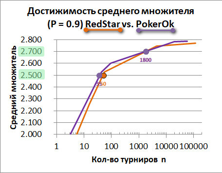 Для вероятность 0.9 та же история, только цифры другие. 35 и 50 для множителя 2.5 (Покерок и Редстар, соответственно), и 1800 для 2.7.
