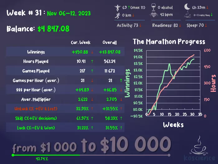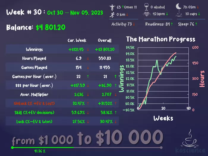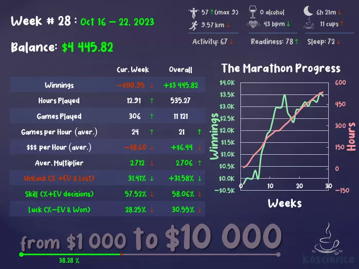 Результаты 28 недели марафона особо не радуют. Я почти не вывожу вставать с утра, а если и встаю, то играю не в оптимальном состоянии, и мне это не нравится. Подступает кризис.