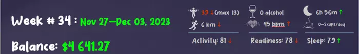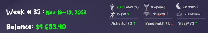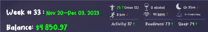 Низкий показатель Readiness из-за того, что наблюдалось повышенный пульс в состоянии покоя, и температура. Два этих показателя очень неплохо отражают общее состояние организма - я и правда чувствовал себя не лучшим образом все дни.
