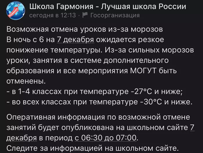 Занятия отменили. Интересно получилось накануне морозов. Достоверно было известно, что ночью будет похолодание до -27, но занятия отменили только по факту, уже утром. Нафига, спрашивается, нужны прогнозы вообще, если на их основе нельзя принять значимое решение?