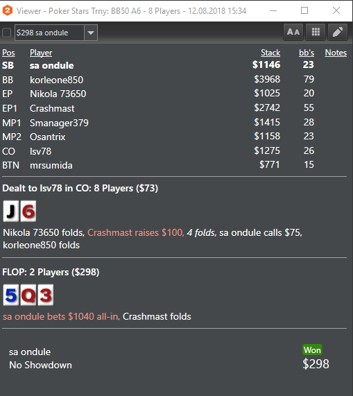 На момент прекращения турнира в игре осталось следующее количество игроков: 3. Количество Ваших фишек: 3 634,00. Общее количество фишек в игре: 13 500,00. Оставшаяся часть призового фонда: USD 5,94, минимальный приз: USD 1,18.
