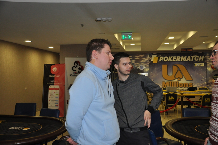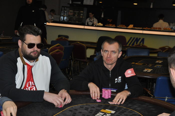 Коротыши несколько раз удваивались за полтора уровня. Макс пошел в оллин 80 к с получил два колла от Марковича и Дениса Доска валет-хай подошла Денису, у которого были Нолик покидает турнир на баббле