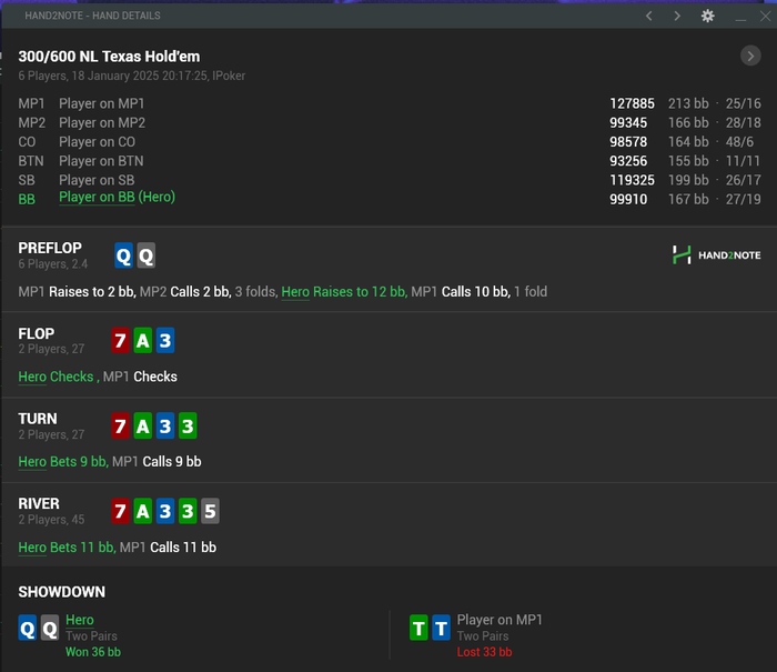"Настрой на сессию был боевой, задался целью отыграть без тильта, так как последние два воскресенья сильно подгорало. На финалке Space KO сложных решений почти не было. Терпеливо фолдил, потом с QQ словил рестил от оппонента с 33 и удалось дожать.