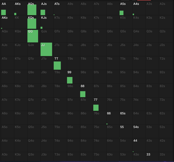 Получив от него колл, сводим его рендж примерно к такому: 77+, AQs, AJs, A5s, KQs.