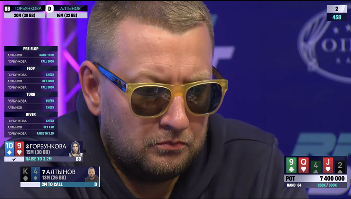 По ходу турнира выбил Патрика Леонарда, Андрея Новака и других профи. А с Топ 12 выбил всех оставшихся игроков, включая Futti18 и Lena 900. Когда оставались в топ 4, я поехал с AQ в тройном олл-ине против 99 и 99. На флопе хитнул туза и увидел 100%. От крика “Сюда нахуй!!!” прибежала жена)