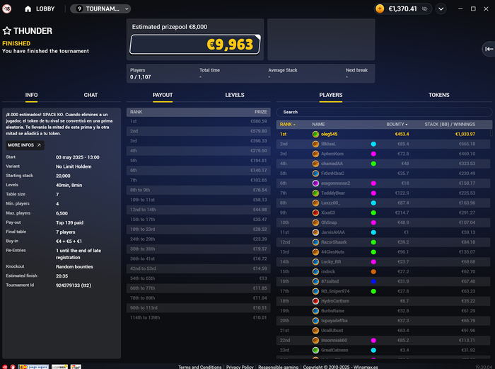 🔹Дима Randyzerg — за одну сессию четыре раза занял первое место и еще один раз — второе. Призовые: $2,510.94 + €845.47 + €2,420.4 + €3,497.69 + €507.02 = 9,781.52;