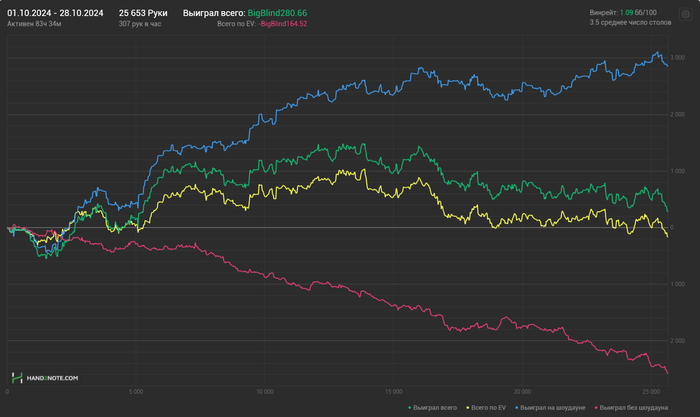 I_got_Luck, тут красная -100бб/1к раздач, что дефолт для страты тса, как я понимаю и при 10бб/100 винрейта. А в целом да, когда ты попадаешь во флопы намного реже своих оппов, то логично, что красная начнёт пробивать пол.
