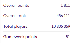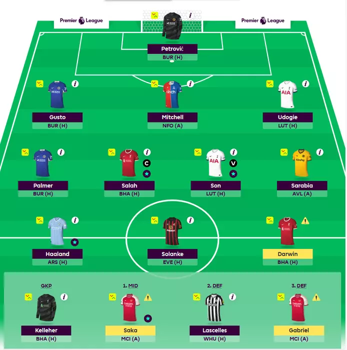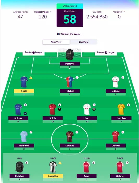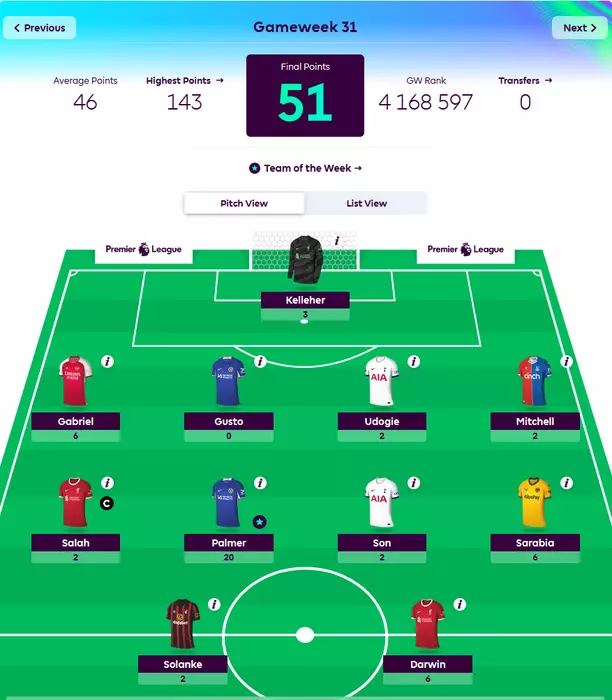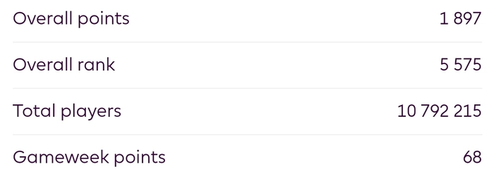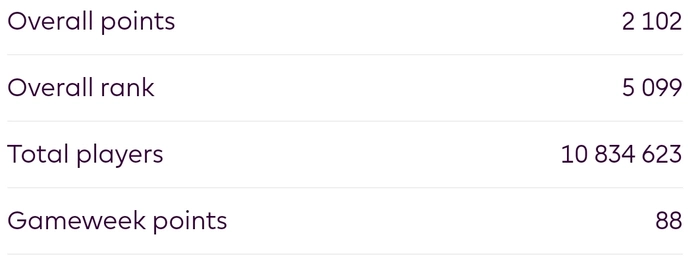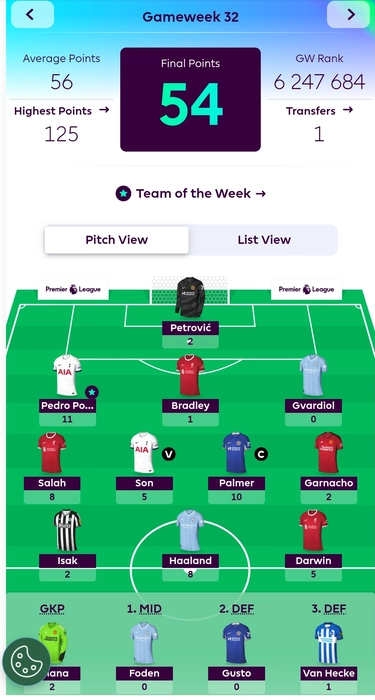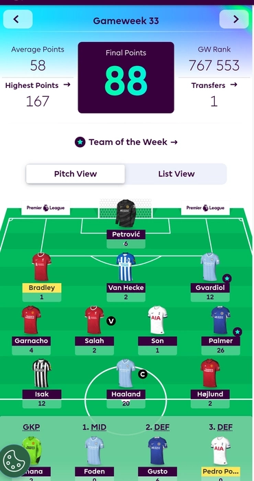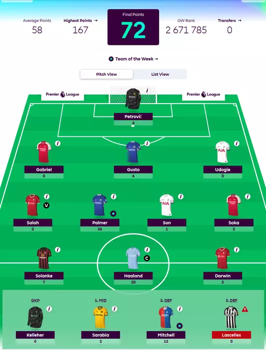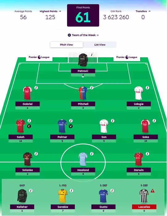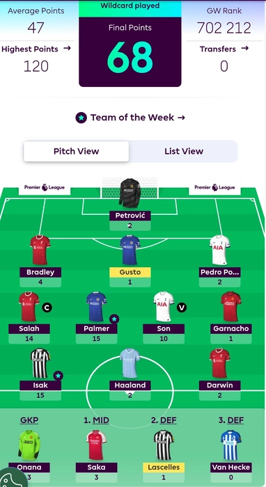 Неудачный тур, но сам виноват, поспешил с продажей Сака на Фодена, если бы подождал до дедлайна, то сохранил бы трансфер и набрал на 8 очков больше, инфа о бенче Фодена появилась до дедлайна. С капитаном тоже получилось не идеально, но к счастью все популярные капитаны набрали близкие очки.