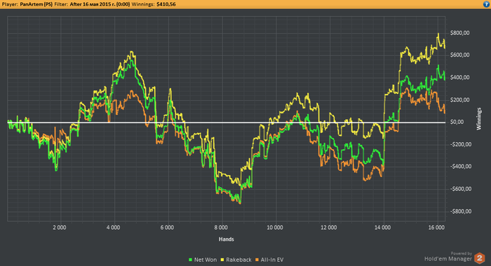 Тяжелый отрезок. Качает сильно. День в одну сторону, день в другую. Хоть переходи на игру через день Пару деньков были провальные, как писал об этом ранее. Последнии дни стараюсь, и получается, держать игру на уровне. Осталось отыграть 17к рук. Оценка 6/10