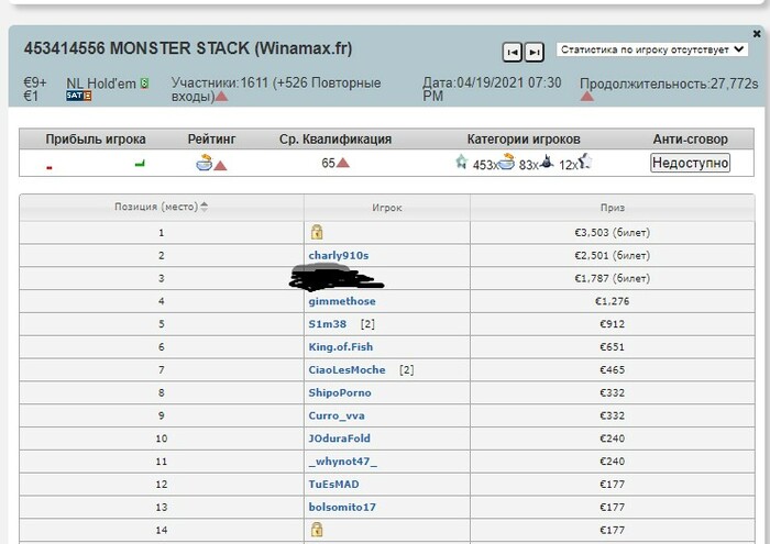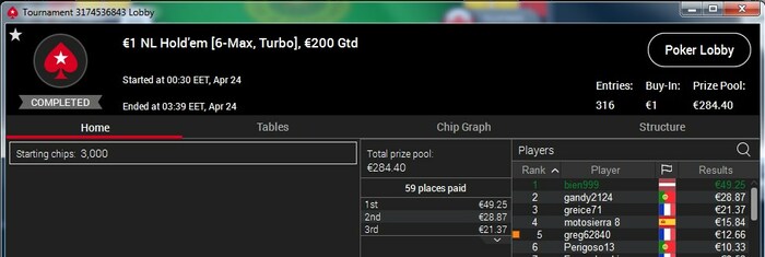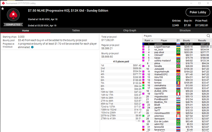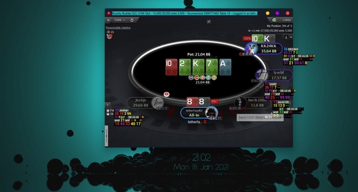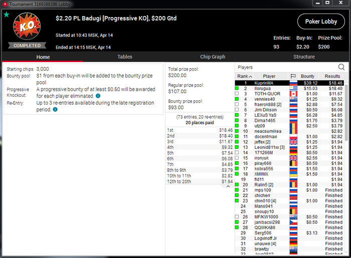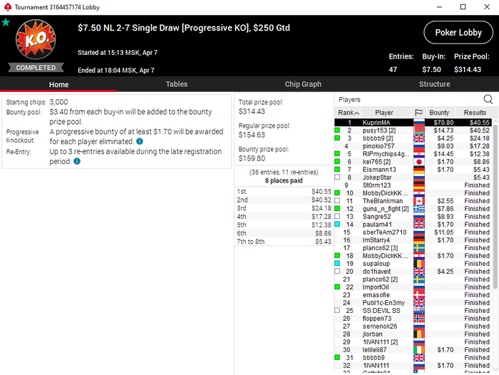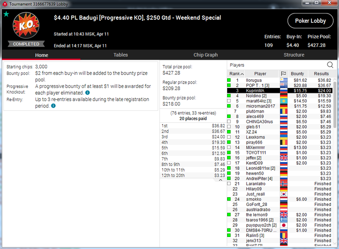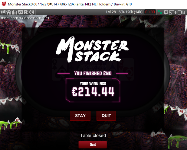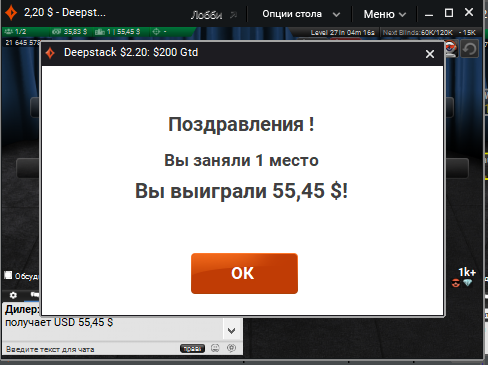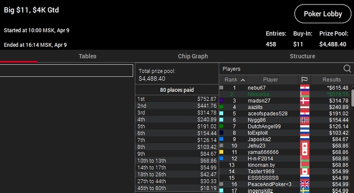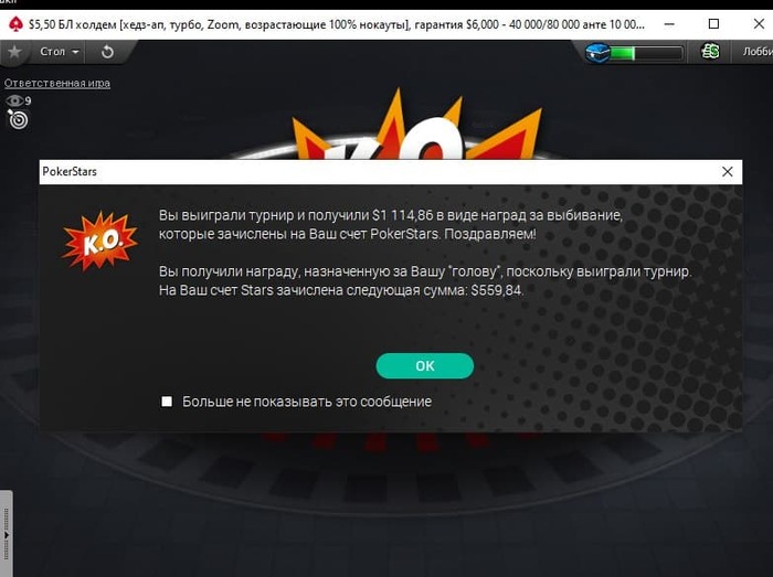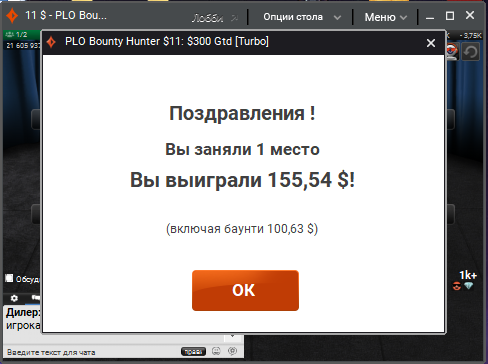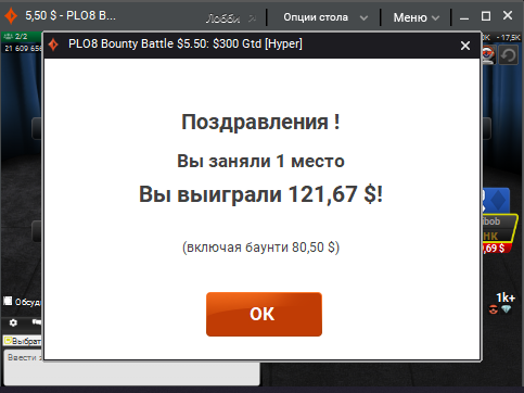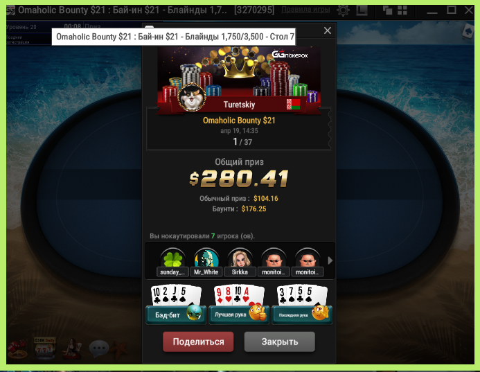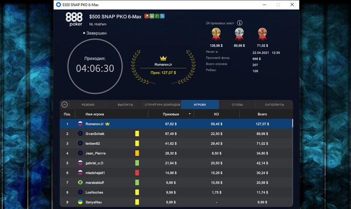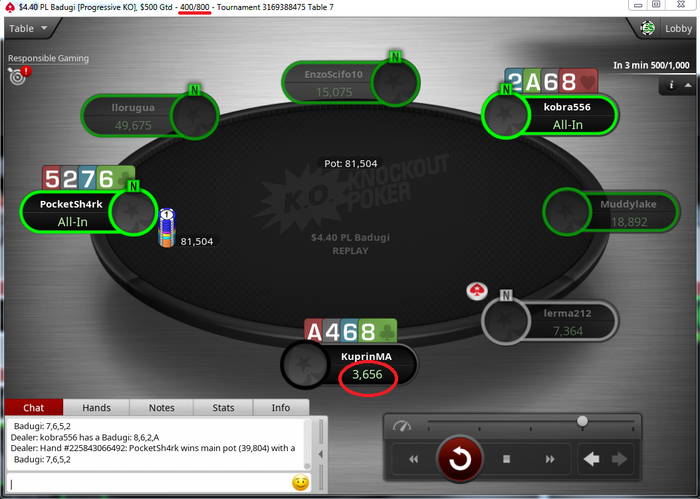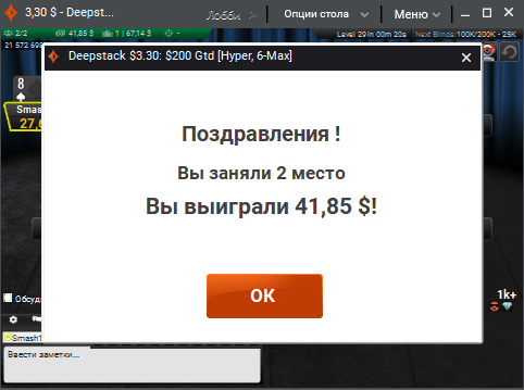 Вторая победа в бадуги за день и снова в хедз-апе с тем же уругвайцем. Пришлось вскрывать его дорогие блефы, но все разы я оказался прав. На баббле финального стола раздали грязь и у меня остался самый короткий стек - 4 бб. Затащить после такого ещё приятней