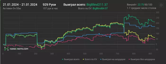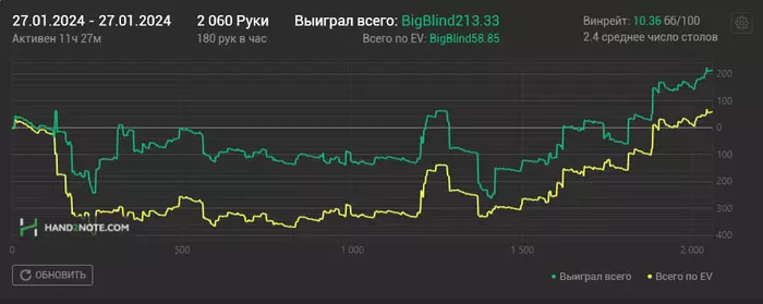 Уменьшил количество столов , сейчас оно в районе 5 на основном мониторе где фул фокус . Отключил временно анонимные столы , результаты там не очень и мне кажется они мне очень сильно режут ожидание , решил что сейчас пусть я буду катать мало рук но главное это качество , набраться уверенности и начать плюсовать.