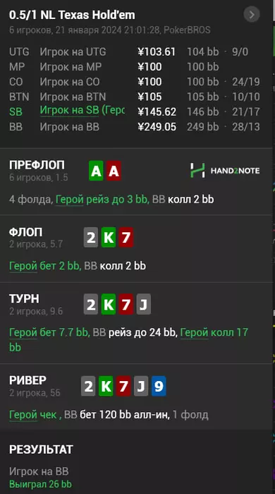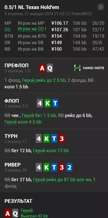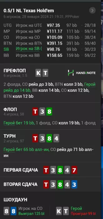 Руку я конечно выбрал не очень так как сам блочу его основные блефы , смутил меня именно сайз , обычно поляна более жадно играет и ещё докручивает , поэтому показалась мне слабость в его сайзинге какая-то , да и я тоже ни на что не капнут и по сути спот выглядит не блефовым на первый взгляд с моей стороны .