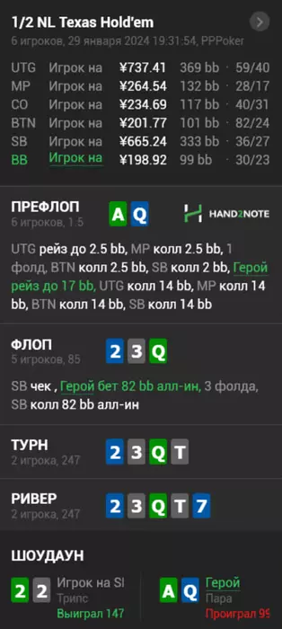 с АДо кмк переиграно, опп должен так вельюбетить KJ, чтобы мы тут пушили АДо. Будет ли он так играть с KJ? (не понятно). Ну и выглядит так, что он зарыл просто оесд/гатшот флопа, т.е мы и так были старше, получается, что таким пихом выбиваем руки слабее и оллыним сами в себя. Если видишь лик в сайзе и логике раздаче, тут опция колла тоже есть. Ну и если выбирать уже комбу блефа, то QJ у нас получше будет (особенно QJ чирвовые).