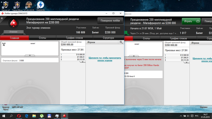 carbofoss @ 1.5.2019 С 200-миллиардным турниром бортанули походу, старый турнир отменили, новый начали, в старом нельзя отменить регу, в новый как то регается народ...