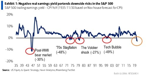 Кстати, в пятницу Bofa писал следующее: за всю историю наблюдений, было только 4 случая отрицательной реальной доходности в SP500.... все они привели к медвежьим рынкам. Сейчас реальная (с поправкой на инфляцию) доходность S&P 500 = минимум за 74 года.