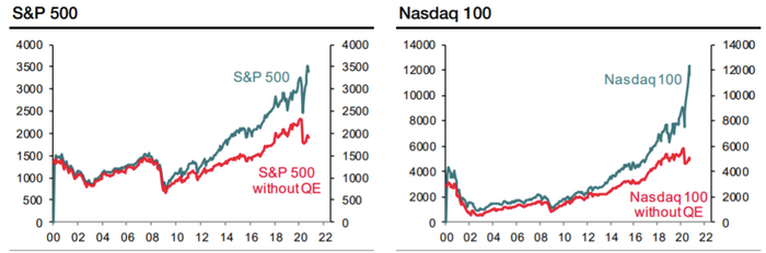 Вот график, что бы из себя представляли SP500 и Nasdaq без QE