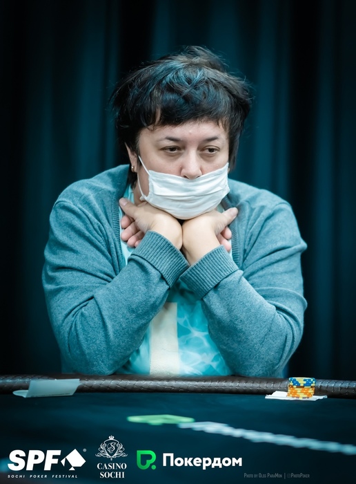 До четырёх блайндов опускались соперницы Татьяна, но та удвоила обеих. Кудрина выиграла у неё > , поймав восьмёрку на ривере, а Довгаль устояла с валетами против . Тем не менее, преимущество Татьяны по-прежнему велико.