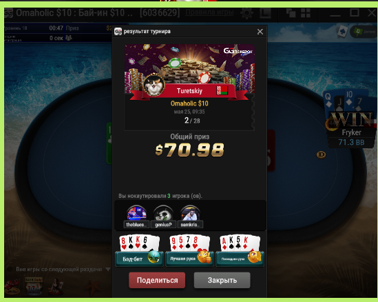 vot_eto_prikol, Месяц всегда по разному, т.к. есть дела , думаю турниров 600 наигрываю , РОИ 20 примерно. Сегодня на пати был шанс выиграть около 700, но опять второе, почти все коин флипы проиграл