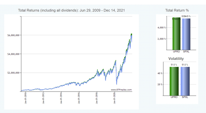 UPRO вырос в 57,7 раз, SPXL - в 55,9 раз. Разница за счет того, что комиссия слегка различается.
