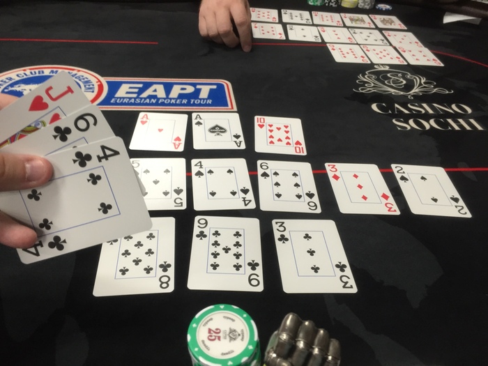 флоп. Чек, ставлю 10к, ещё минута раздумий и пас