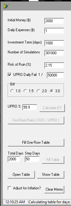 Следующий этап - это используя эту процедуру нужно найти оптимальное соотношение для VOO / UPRO, чтобы процент банкротств не превысил наш заданный порог, но максимально близко к нему приблизился. Для этого я использую несколько усовершенствованный алгоритм двоичного поиска и получаю искомый результат. Это и есть ответ, который дает Бифф 1. Он тоже очень быстрый (пару сек) и дает нам первое приближение в наших следующих расчетах.