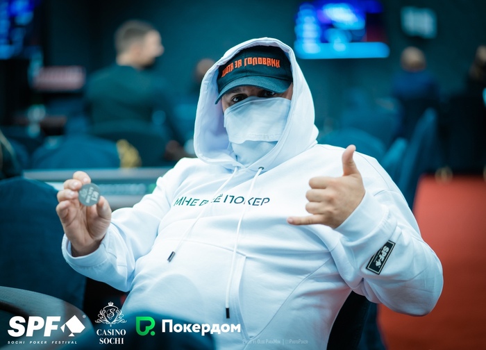 Сергей Тихонов только что был на грани вылета, но, выиграв четыре олл-ина подряд, довёл стек до 250К. Попутно он выбил Дениса Матсона (за него был очень солидный баунти) и Дмитрия Пономарева. Сейчас за Сергея дают 1315.