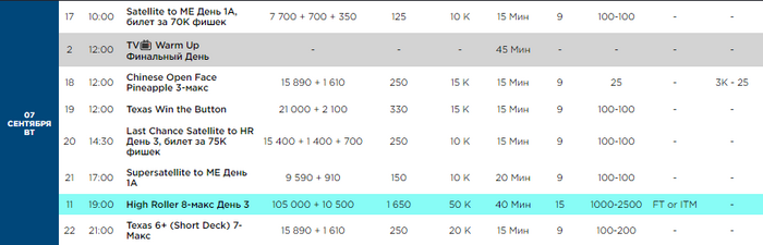 Ряд турниров проходит одновременно с этой финалкой. В китайском ананасе играют 14 человек, в Win The Button в игре 40/57. В сателлите к главному событию было сделано 99 входов, в розыгрыше 14 билетов.