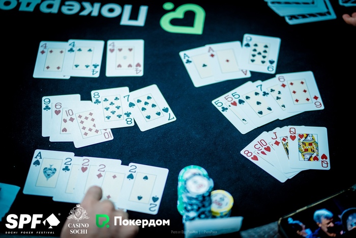 Нарек Арсенян зарейзил 100,000 с первой позиции, Аркадий Стекольщиков с СО поставил ему олл-ин 520,000. Когда почти все оставшиеся участники отправились на перерыв, Нарек бросил фишку для колла.