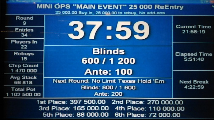 15:00 MAIN EVENT Re-Entry по 25 000 руб Гарантия 1 000 000 руб _ стартовый стэк 30 000 _ стэк на Re-Entry 30 000 _ поздняя регистрация и период Re-Entry 8 уровней _ длительность уровней по 40 мин _ фуршет для участников турнира