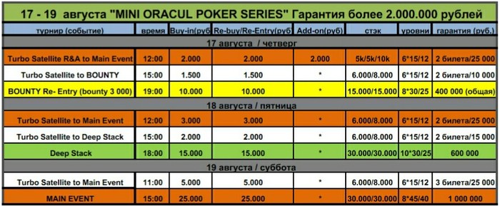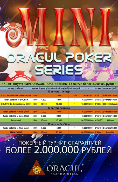 Дорогие друзья!!! Уже менее чем через 2 недели, а если быть точнее с 17 по 19 августа пройдет 28-я мини серия "Oracul Poker Series August 2017" Гарантия более 2.000.000 рублей