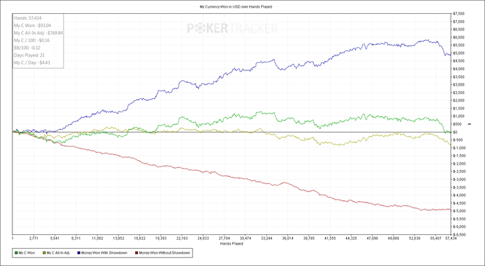 Теперь, что касается совета о том чтобы замечать свою хорошую игру. Для меня он не годится совсем, потому что я много раз отмечаю свою игру (где удачный блеф прошел, где вскрыл качественно). Проблема в том, что чем больше я играю качественно, тем больше я начинаю играть не качественно. Сам себя могу залевелить, вскрыть "блеф" и т.п. Вчера играл по факту в минус 250 по EV в плюс 250. Очевидно, что при этом показывал качественную игру. Закончилось все тем, что остановился при минус 400 и минус 100 по EV. Куда деваться от того что было, тильт в конце накрыл, признаю.