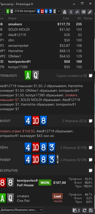 А, эта херня оппонента жирным выделяет, хиро на ер... Тогда флоп от чека.