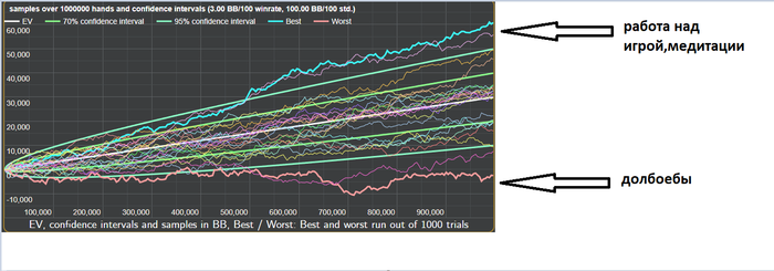И приводить примеры старожилов, звёзд покера и тд - глупо, уверен, что немалая часть этих людей и вне покера бы так или иначе реализовались, учитывая хорошую работоспособность, усидчивость и тильтоустойчивость. Мы говорим, про среднестатического Васю, напомню, в ИРЛ не нужно входить в какой-то неебический процент 2-5, чтобы зарабатывать несколько медианых московских зарплат.