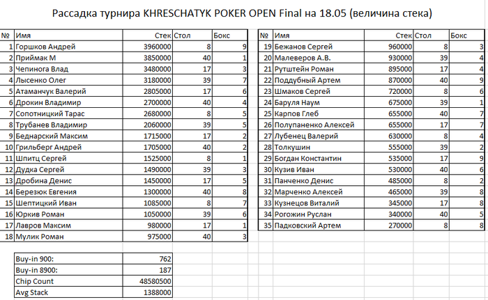 35 бойцов в 17:00 продолжат сегодня борьбу за призовые и кубок турнира Khreschatyk Poker Open! Чип-лидером начнет финальный день харьковчанин Андрей Горшков. У него 3 960 000 фишек