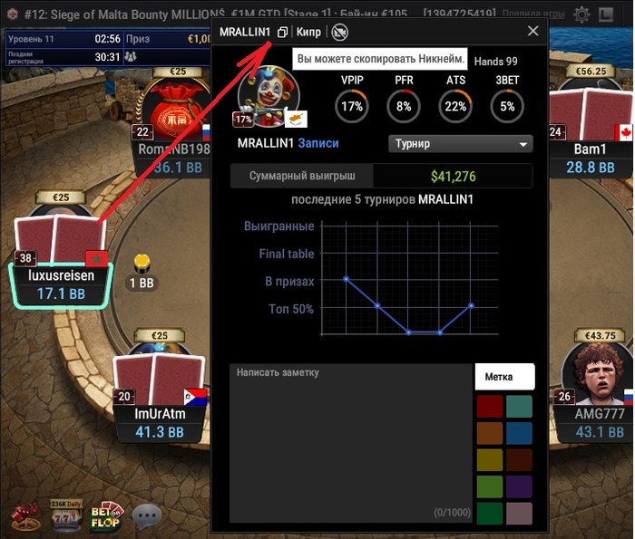 I_am_Arty_1 @ 27.04.19В руме есть еще одно интересное промо: еженедельный фриролл на 5000$, для получения билета нужно с воскресенья по субботу каждый день выполнять одно из трех предложенных заданий, при выполнении 5 вы получаете билет, при выполнении 6 и 7 стартовый стэк будет больше, посмотрим насколько там сложные задания, сколько билетов мы сможем получить и сколько там наберется народу.