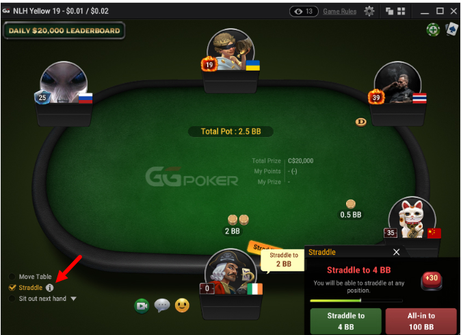 2) Страддл (Straddle) – необязательный блайнд, который вслепую ставится по личному желанию и усмотрению игроком, следующим после ББ. В ПокерОК и GGPoker действуют особые правила этой слепой ставки. Они позволяют любому игроку ставить страддл независимо от того, в какой позиции он играет.