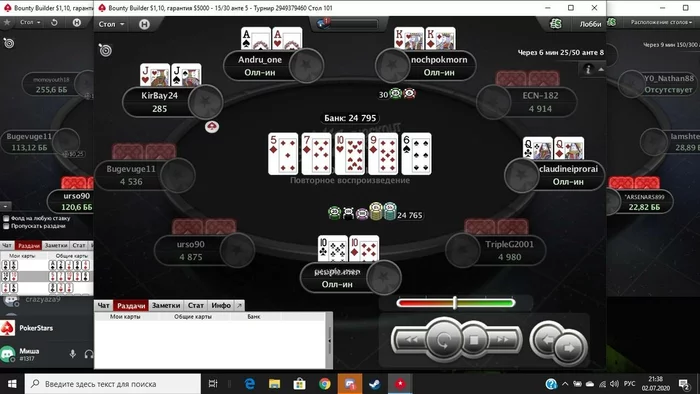 Пятый олл-ин во второй раздаче турнира: 1010 против JJ, QQ, KK, AA — и я выиграл! Скриншот храню до сих пор.
