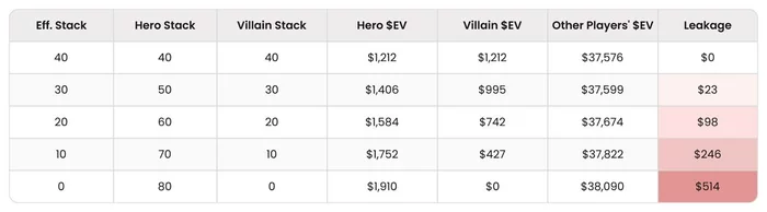Это самый наглядный пример утечки $EV. В турнирах денежная ценность вашего стека ($EV) может изменяться, даже если количество фишек в стеке остаётся прежним.