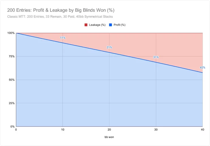 Удивительно (а может, и неудивительно), но результаты почти не изменились. Утечка — как в долларах, так и в процентах — примерно такая же, как и в случае с 200 игроками. Технически эта ситуация ближе к баблу по проценту оставшихся участников, но премия за риск (бабл фактор) практически идентична.