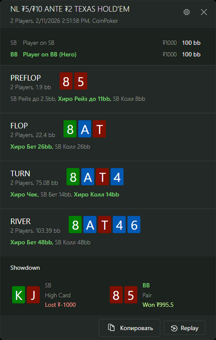nosp77 @ 26.02.26Во сколько бб/100 оцениваешь ожидание в худшей позе за столом с любителем уровня cardsforfun(как я понимаю это был именно он на БУ)?