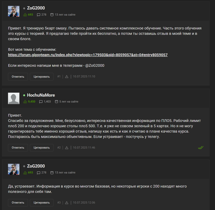 Катал в основном 5 карт. Переходил из 4-х сразу на рабочие лимиты. За помощь в переходе благодарен vision, plo trainer и тренеру с форума ZoG2000, - парень точно шарит, курс у него хоть и недопиленный был на тот момент, но освежить и дополнить мои знания он точно помог. Чтобы не думали, что это реклама - я его знать не знаю лично, выкладываю нашу переписку из ЛС на форуме под спойлером:
