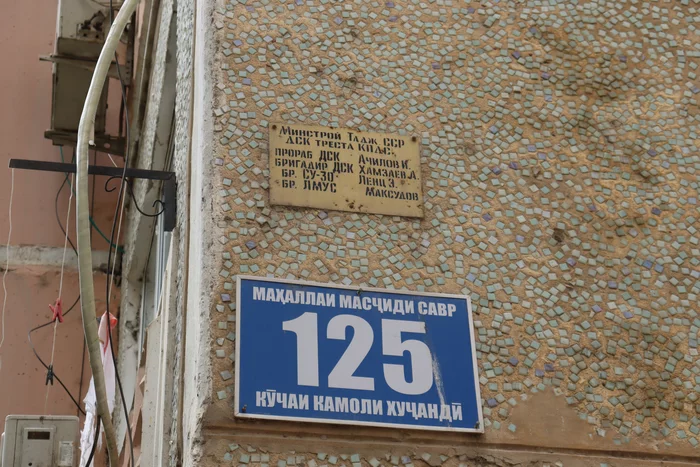 Нумерация домов и улиц на таджикском и английском в центре.