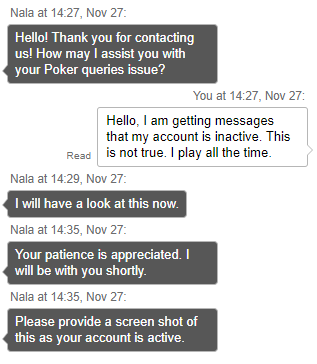 Необходимо обратиться в лайв-чат поддержки покер-рума на официальном сайте покер-рума в разделе Contact Us внизу страницы и сообщить о данной проблеме (общение на английском языке, но можно использовать онлайн-переводчик):