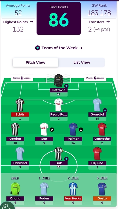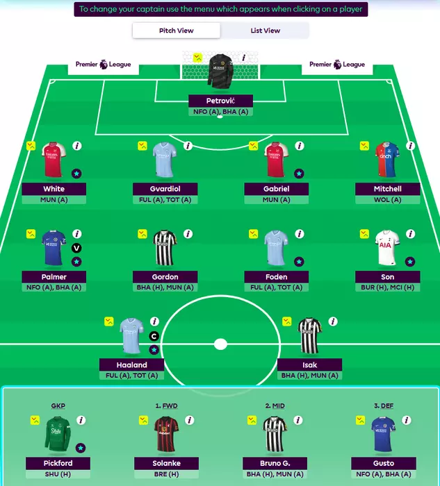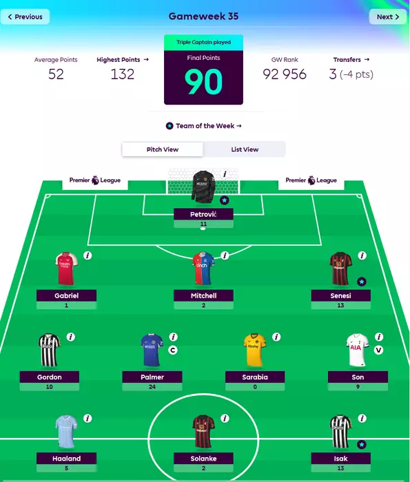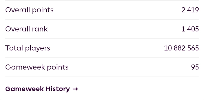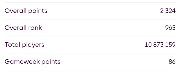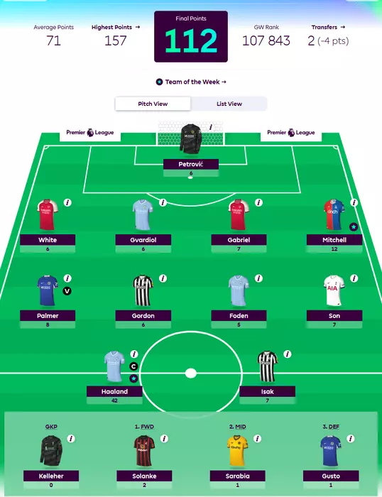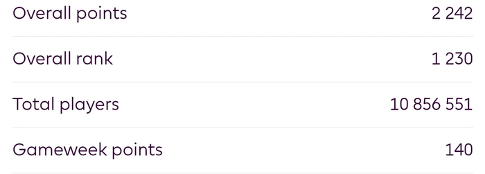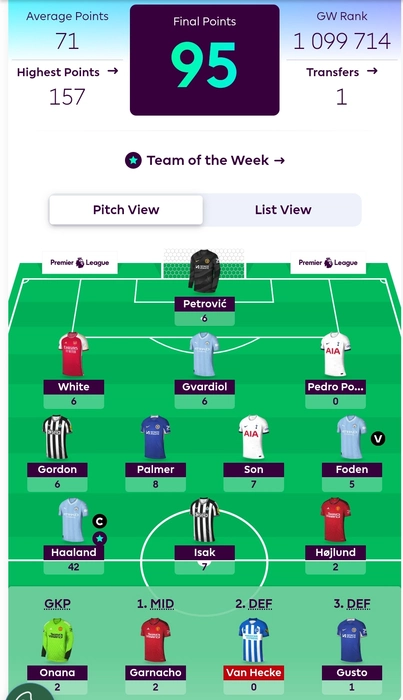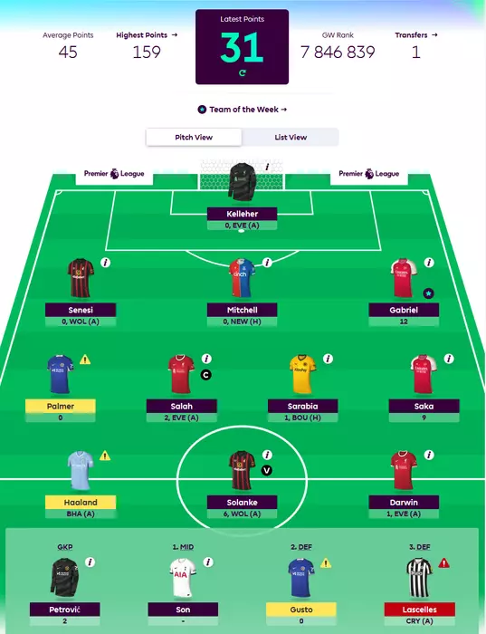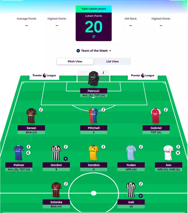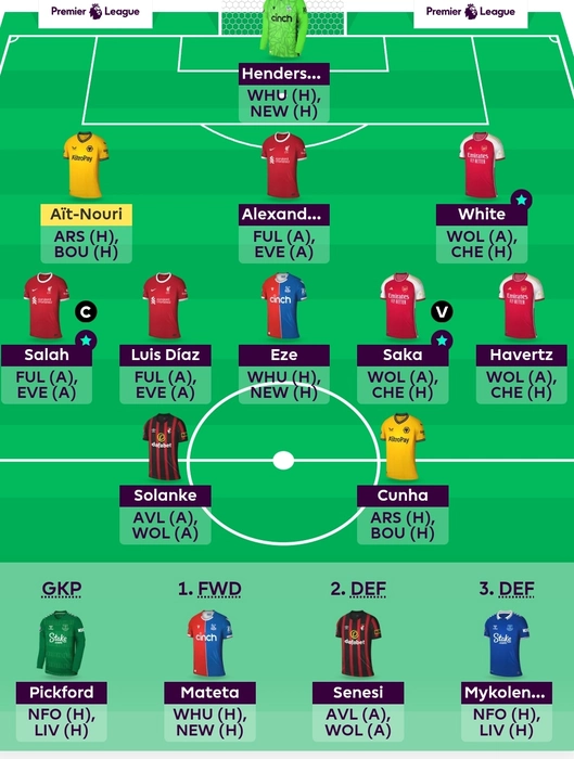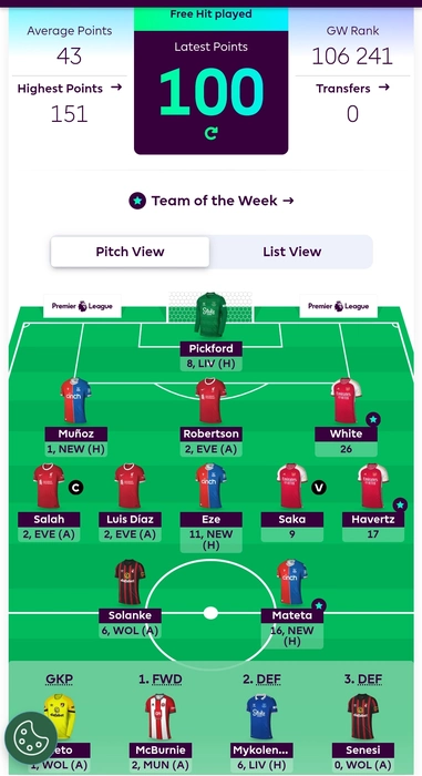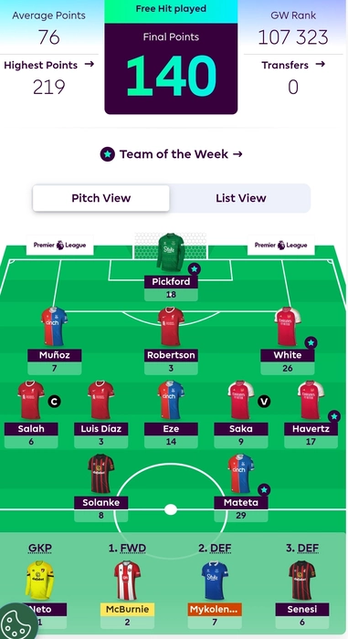 Сделал несколько изменений перед дедлайном, прошла инфа, что травма у Куньи, и Айт-Нури точно не будет в старте, поэтому заменил их. И повёлся на прогнозы "спецов", что Трент не будет играть (тут ещё Клопп ввел в заблуждение на прессухе после матча с Аталантой, сказал, что не понимает как Трент так много времени отыграл), заменил Трента на Робинсона, эта замена оказалась неудачной, Трент вышел и хорошо набрал с Фулхэмом. Тем не менее жаловаться грех, Уайт и Хавертц сильно бустанули своими дублями, на табло сейчас красивая круглая цифра и в моменте топ 1.5к оверолл. Конечно, удержаться будет трудно, дальше у поляны пойдут массовые ВК, который я уже использовал, да и этот тур ещё надо завершить. Тем не менее, приятно))