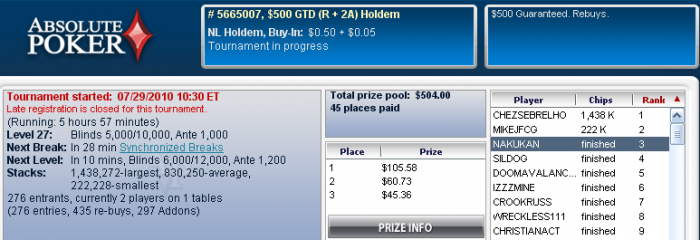 Вчера в середине турнира было у меня 2 средних стека) и я их душевно проиграл парню колящему всё ) Префлоп : рейз, я ререйз с АК, агрообезьянка колл, флоп 677; он бет я ререйз он аллин я доставляю ) там 64o ))) и большая часть стека улетает) Впринципе сам накосячил, но всё же обезьяне заходило... После заноса у меня дела тоже не очень, вылетаю в стиле QQ<KJ, AA< Q9(!) префлоп АИ, думаю не стоит отчаиваться запас в 100 БИ есть, будем катать и катать) Тошику кстати респект за то что постоянно про БРМ напоминает)