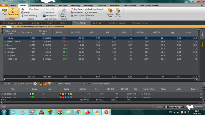 Laphroaig23yo @ 28.8.2013 Катаю 3.5,8 (180) и 7 (45) .Если не сложно поделись такой же графой из вкладки reports > preflop activity с (ev bb ), или подскажи над чем поработать ?)