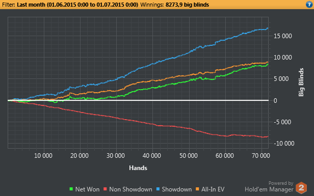 Июнь Всем привет Пришло время небольшого отчета. Если двух словах о прошедшем месяце, играл довольно таки много, почти 200 часов и помимо столов провел немало времени, работая над игрой. По игре складывалось неплохо, временами даже очень хорошо, но допускал много ошибок и переагривал последнее время. Результатом удовлетворен, но нужно лучше, больше, мощнее Винрейты: Все Анте
