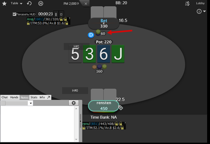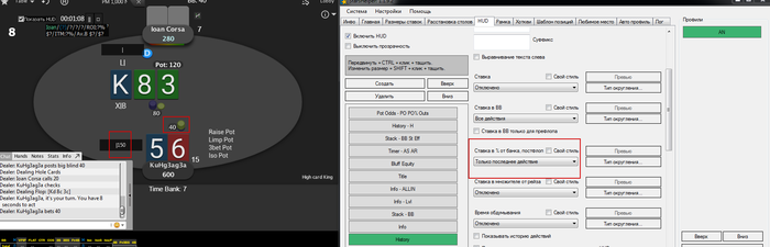 У вас на скриншоте два числа подряд. Первая цифра 1 означает ставка в ББ. Вторая цифра 50 означает 50% от банка. Формула такая: (Размер ставки / Общий банк на момент ставки) * 100 (40 / 80) * 100 = 50