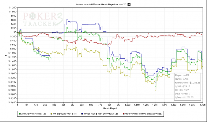 Плохо играл вчера. Много кулеров не в мою сторону, но от парочки мог отскочить, например КК против АА, когда человек только проколлил 4бет и вышел А на флопе, правда у меня ещё было натсовое фд с королём, но он и сыграл чек-колл флопа, тёрн спарился, чек-чек, а на ривере я глупо оплатил большую ставку.