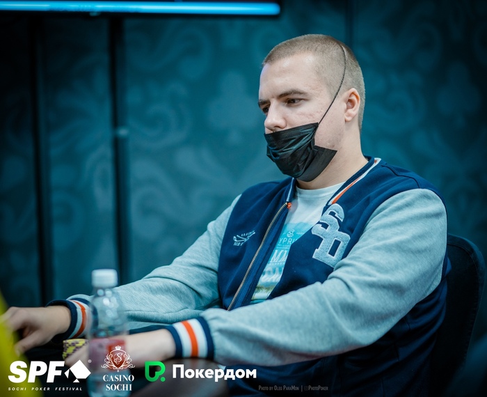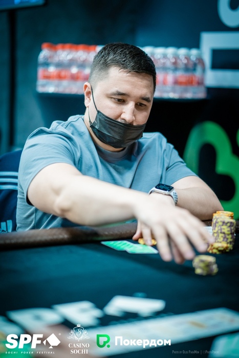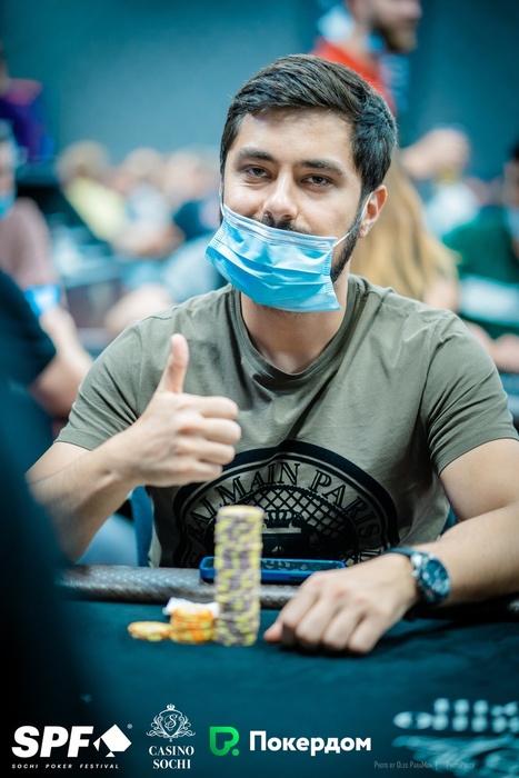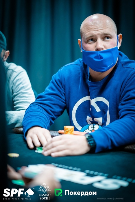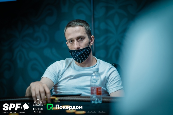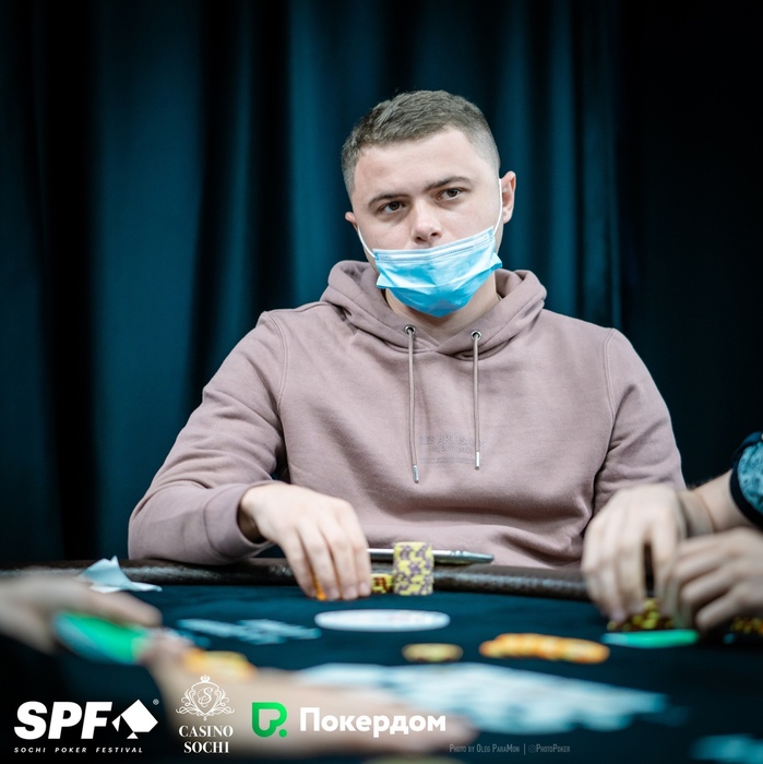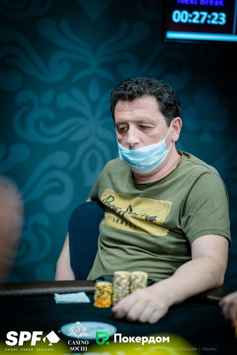 Константин Генералов открыл 15,000 из UTG+1, Артем Зопунян подколлил на СО, Стефан Просторов защитил большой блайнд. На флопе Артем поставил 15,000, Константин и Стефан заколлировали. На тёрне Просторов донкнул 75,000, и его соперники сдались.